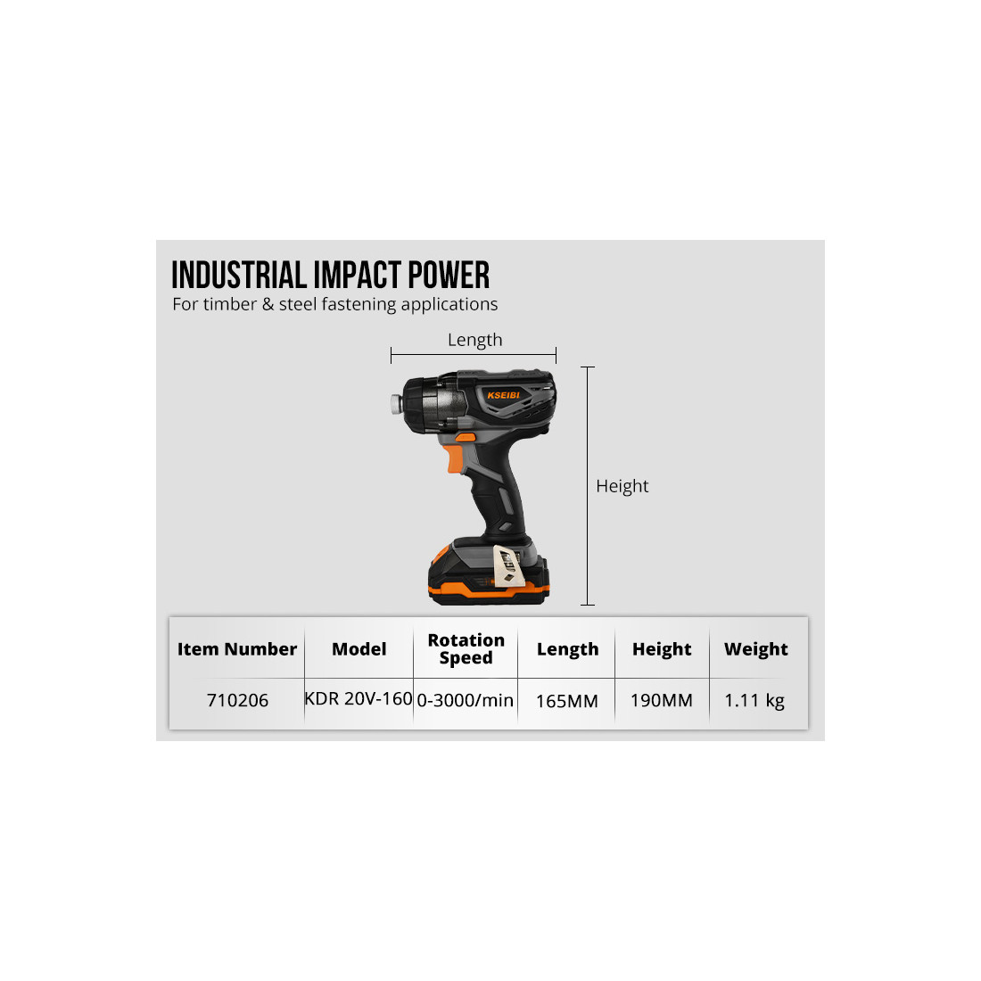Built with KSEIBI’s commitment to durability and precision, the KDR 20V-160 is a reliable choice for tackling tough jobs where accuracy and speed are critical. Whether driving screws into dense materials or loosening stubborn bolts, this impact driver delivers consistent results, every time.