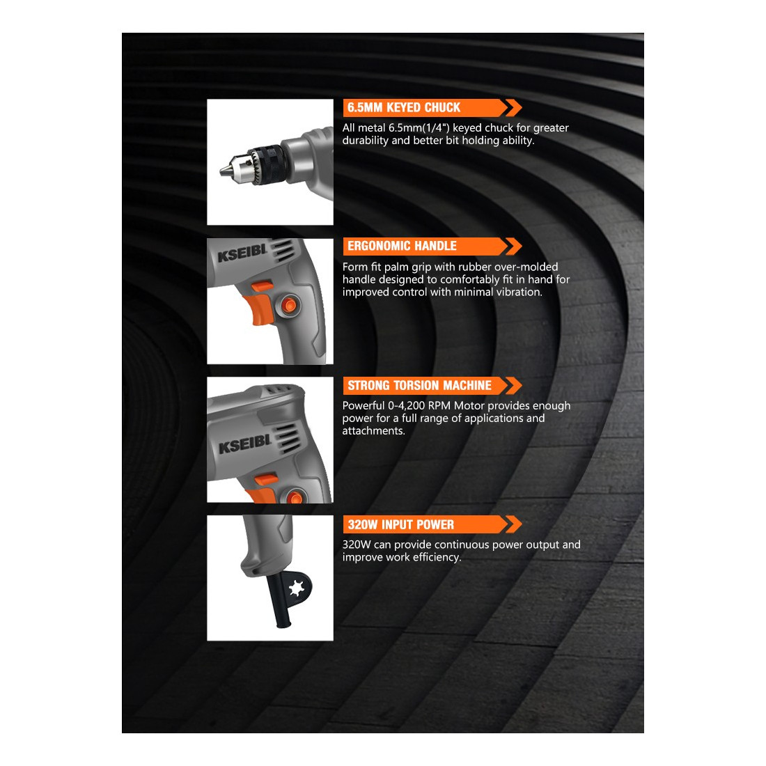 320W Slim Electric Drill / 6.5mm Keyed Chuck | Power Tools | KSEIBI