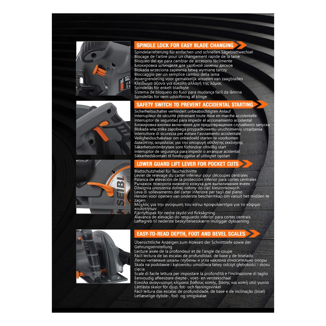 Powerful 1400W Motor providing power & performance 0-45° Bevel Cuts gives greater cutting versatility Lock-Off Switch prevents accidental start-ups Specifications: Input voltage: 220-240/50-60Hz No-load speed: 4500 r.p.m.  Saw blade : Ø 185 MM  Sawing Capacity at 90   °C : 65 MM Sawing Capacity at 45   °C : 43 MM Read more