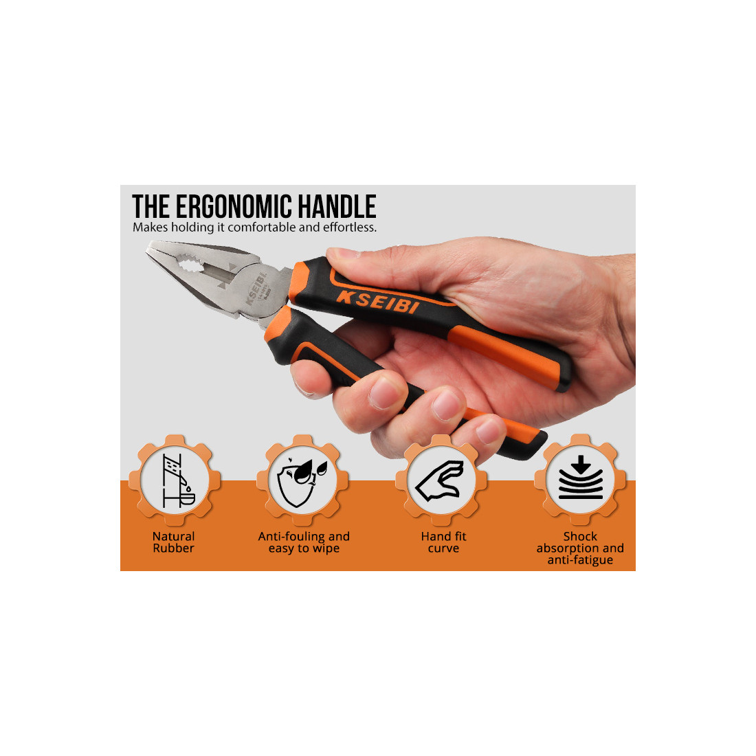 Los **alicates combinados de 6" de KSEIBI** son una herramienta esencial para trabajos de agarre, corte y torsión, diseñada para brindar precisión y fiabilidad en todo momento. Fabricados con acero para herramientas de alta calidad y recubiertos con níquel, ofrecen una excelente resistencia al desgaste y a la corrosión, garantizando un rendimiento duradero incluso en entornos exigentes.