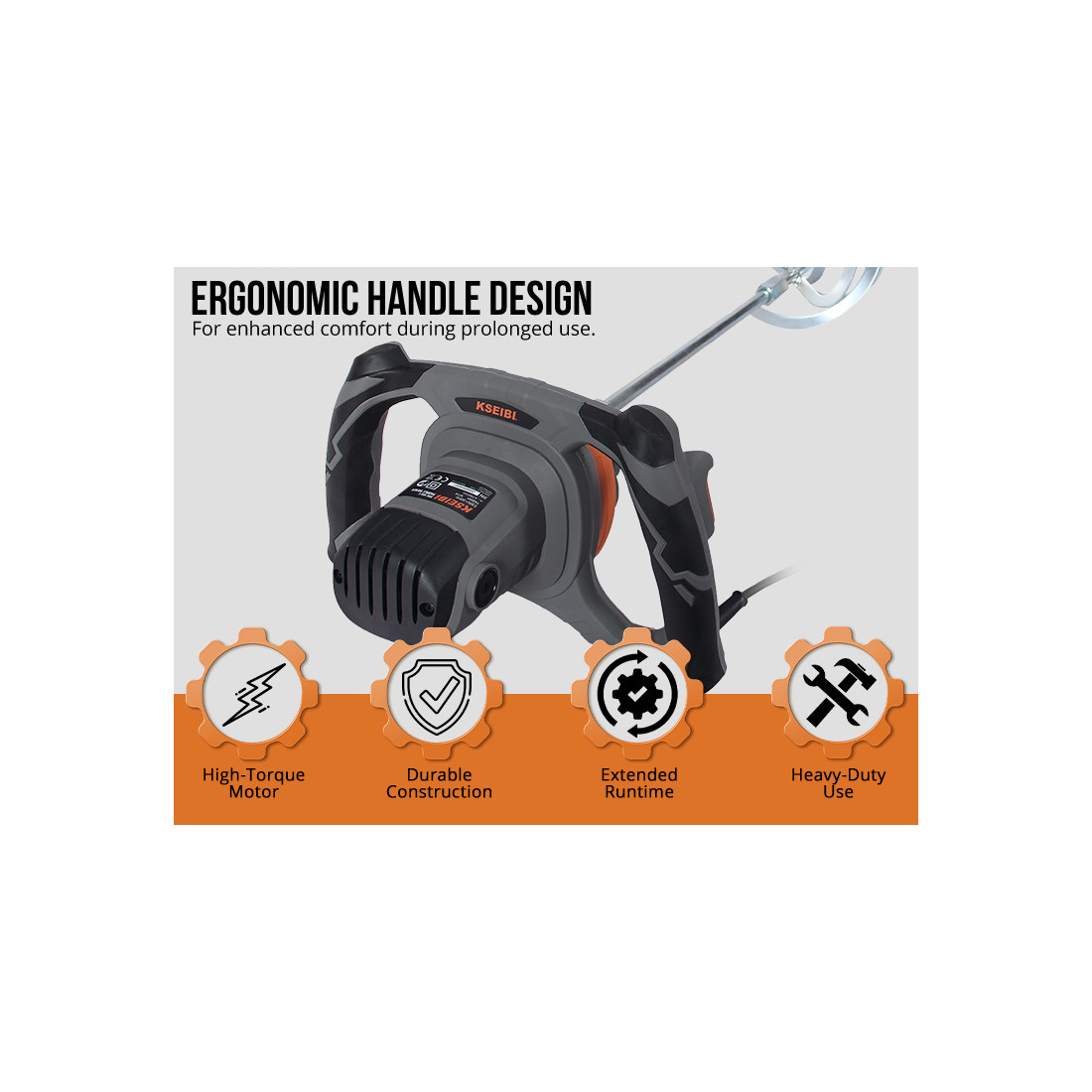 موتور قدرتمند و بادوام این میکسر برای استفاده مداوم در پروژه‌های صنعتی و ساختمانی طراحی شده است، و به‌خصوص در مخلوط کردن رنگ‌های غلیظ، اپوکسی‌ها یا مواد ساختمانی مانند سیمان و گچ بسیار مؤثر عمل می‌کند. دسته‌های محکم و طراحی پایدار آن کنترل بیشتری را در حین کار فراهم می‌کند، حتی در پروژه‌های طولانی‌مدت.