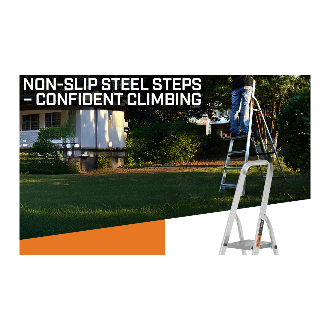 Les marches larges striées et le plateau supérieur antidérapant assurent une bonne assise du pied, tandis que l’arceau de maintien procure un appui supplémentaire en hauteur. Les patins en caoutchouc protègent le sol et empêchent le glissement; la barre de liaison et les rivets renforcés limitent le jeu avec le temps.