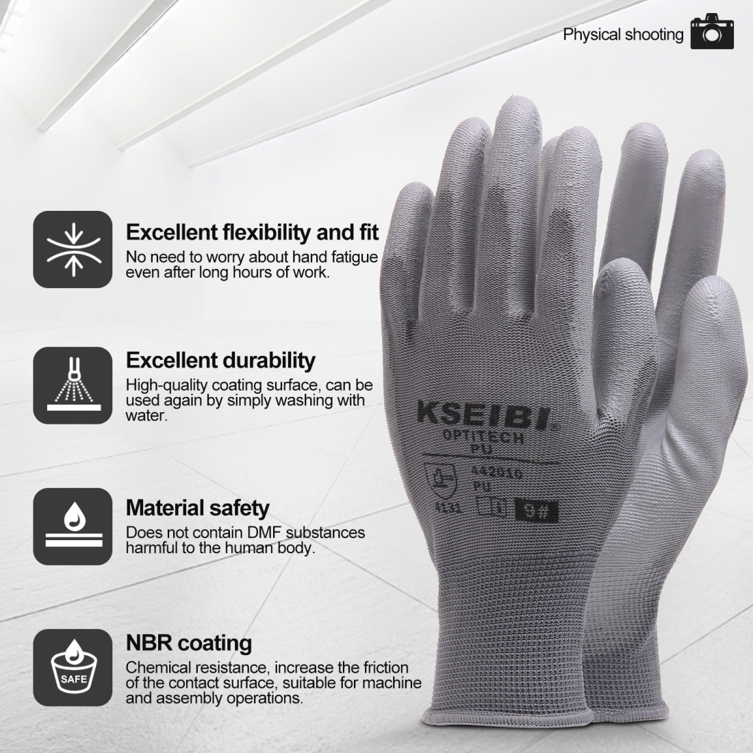 Pratiques et respectueux de l'environnement, les gants sont présentés sur une carte en papier, facilitant leur stockage et leur identification. Idéal pour les professionnels et les artisans qui recherchent fiabilité et performance, le modèle en PU de KSEIBI incarne l'engagement de la marque pour des outils durables et fonctionnels.