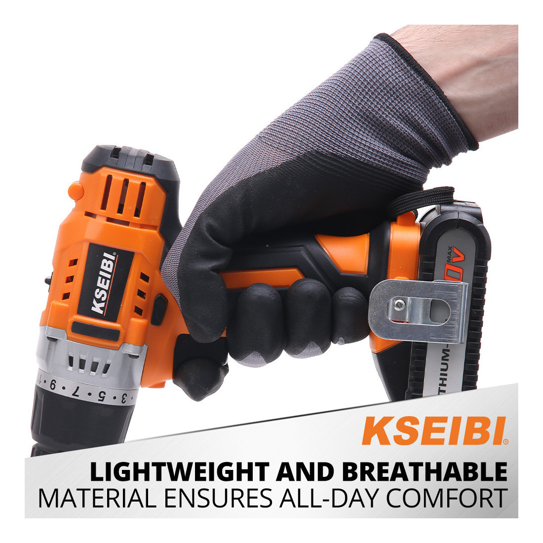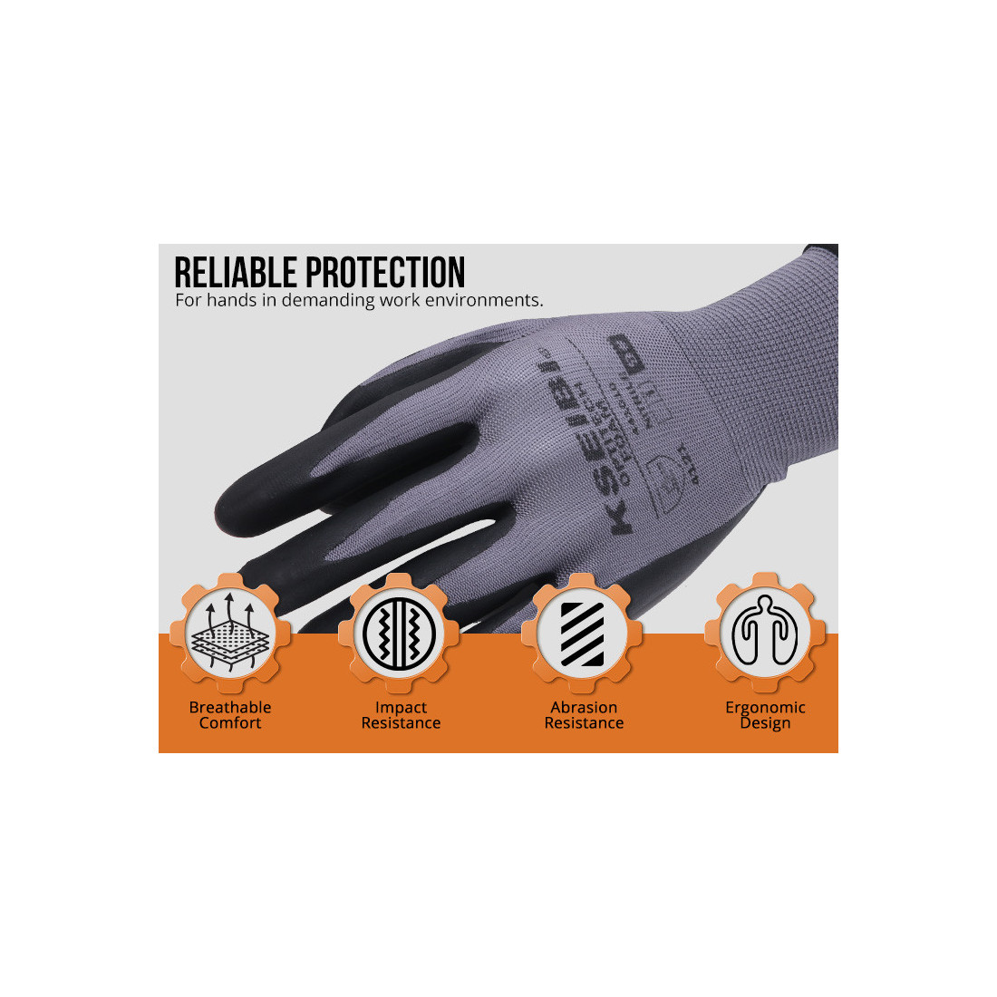 Les **Gants industriels KSEIBI** sont une solution fiable pour les tâches exigeantes nécessitant précision, protection et confort. Fabriqués en polyester résistant, ils offrent une excellente flexibilité, tandis que leurs paumes enduites de PU (polyuréthane) garantissent une prise en main ferme et une durabilité accrue, même dans des environnements de travail intensifs.