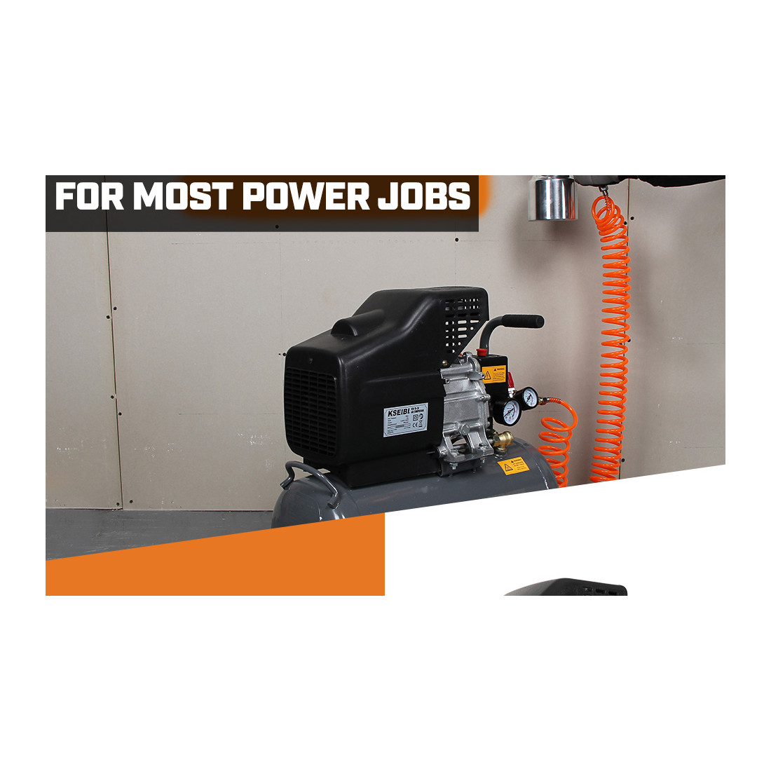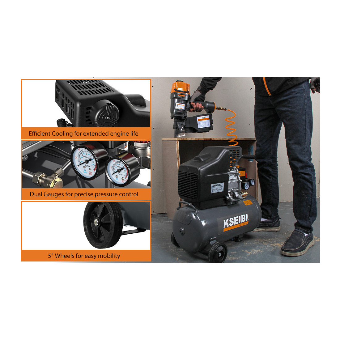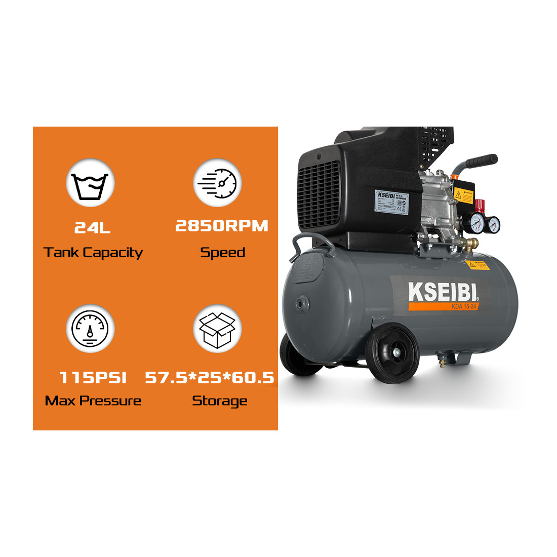 La struttura robusta e i materiali durevoli riflettono l'impegno del marchio KSEIBI per precisione e affidabilità. Il serbatoio da 24 litri garantisce un flusso d'aria costante, mentre il motore da 2HP offre la potenza necessaria per affrontare operazioni impegnative con facilità. Dotato di una configurazione intuitiva, questo compressore è semplice da utilizzare e ottimizzato per ridurre tempi di inattività.