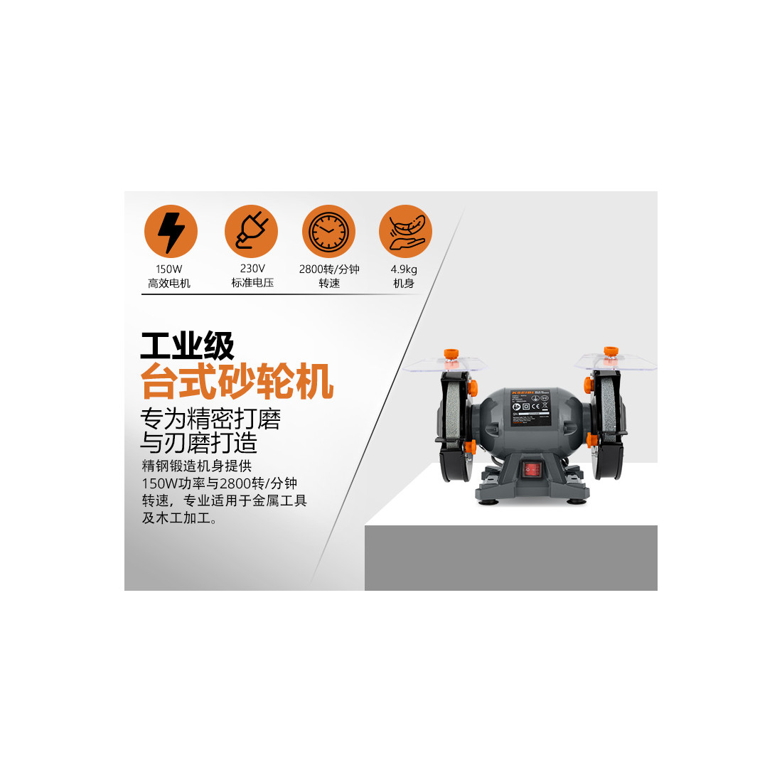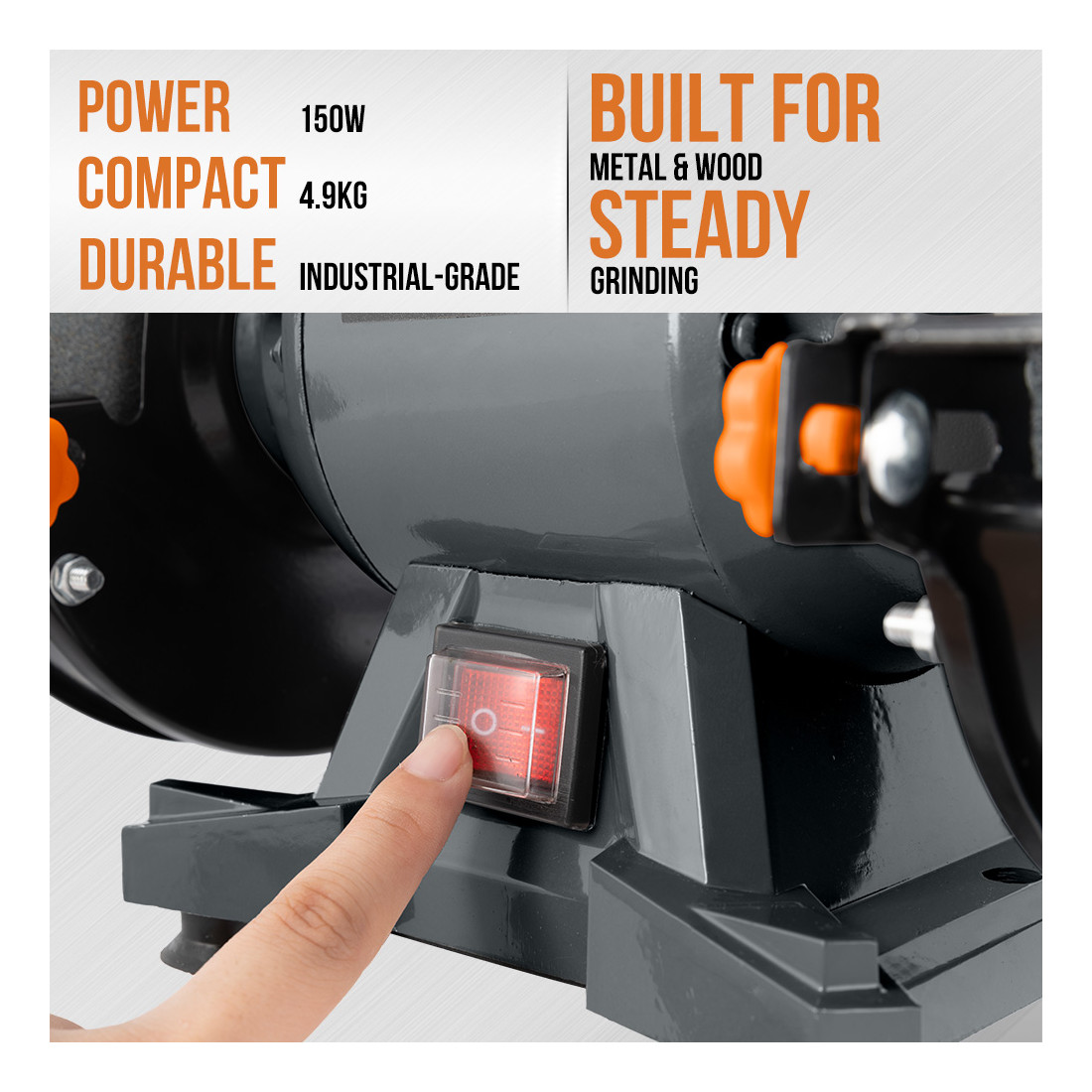 このモデルは、150mmの研削ホイールと150Wのモーターを搭載しており、安定したパフォーマンスを発揮します。モーターは過熱を防ぐよう設計されており、長時間の使用にも対応可能。鋼材や合金などの硬い素材をスムーズに研削できるため、工場や作業現場での用途に最適です。さらに、耐久性に優れたフレーム構造と安定したベースが振動を抑えるので、精密な作業にも適しています。