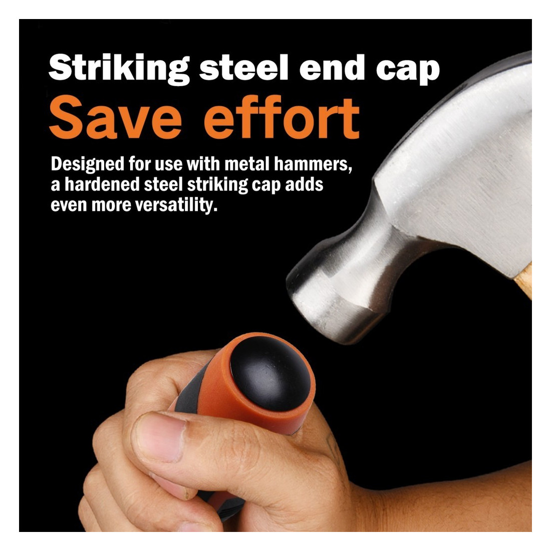 Bevel-edge chisel has a large strike cap and a split-proof handle that withstands repetitive hammer strikes
