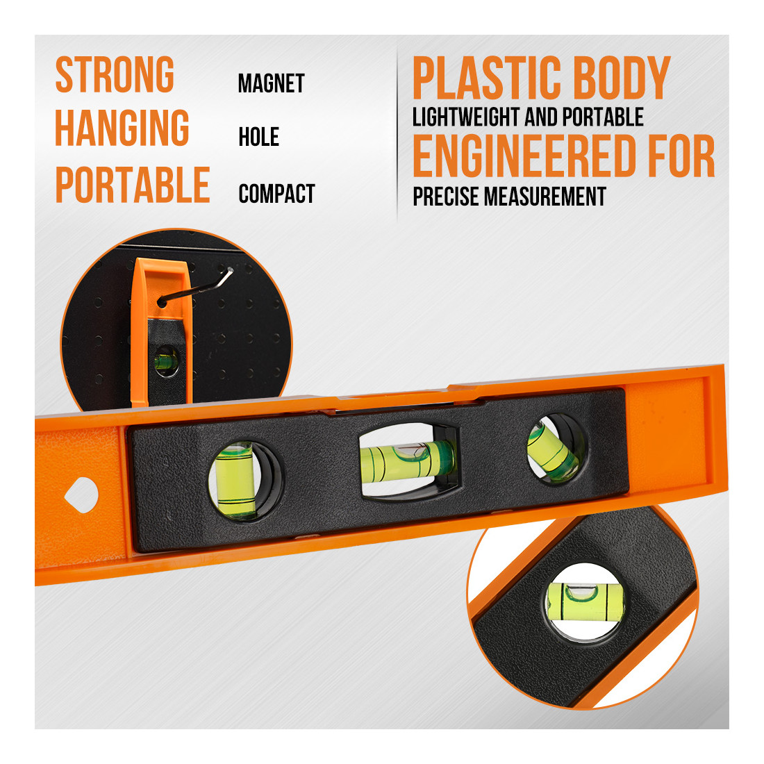 - Possui três bolhas para medições precisas em diferentes ângulos.