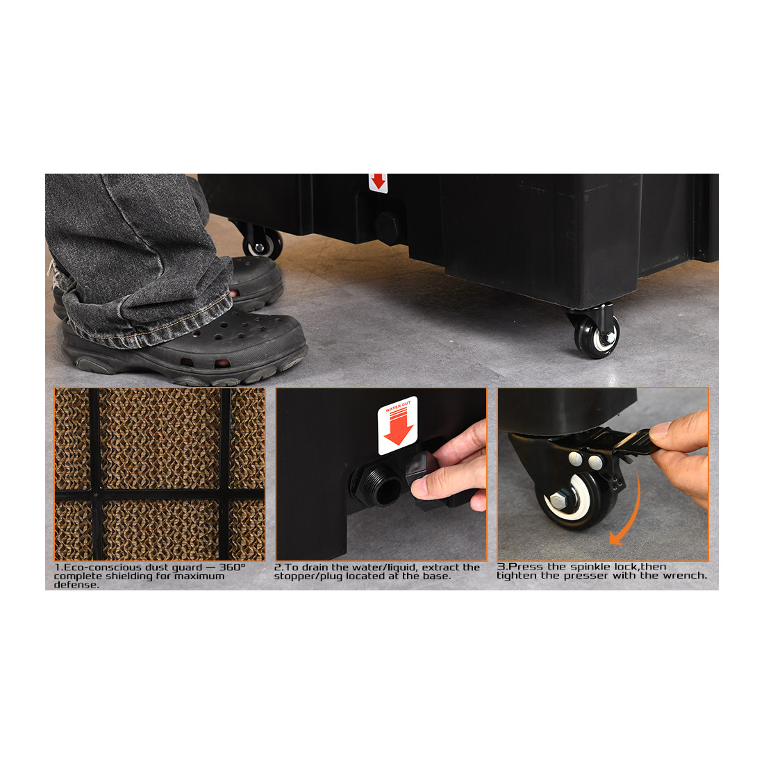Rezervorul de 70 L asigură autonomie îndelungată între alimentări, iar panoul frontal cu comenzi simple permite reglarea debitului și direcției fluxului de aer. Carcasa robustă și roțile pivotante cu frână îl fac ușor de mutat și de folosit în regim zilnic.