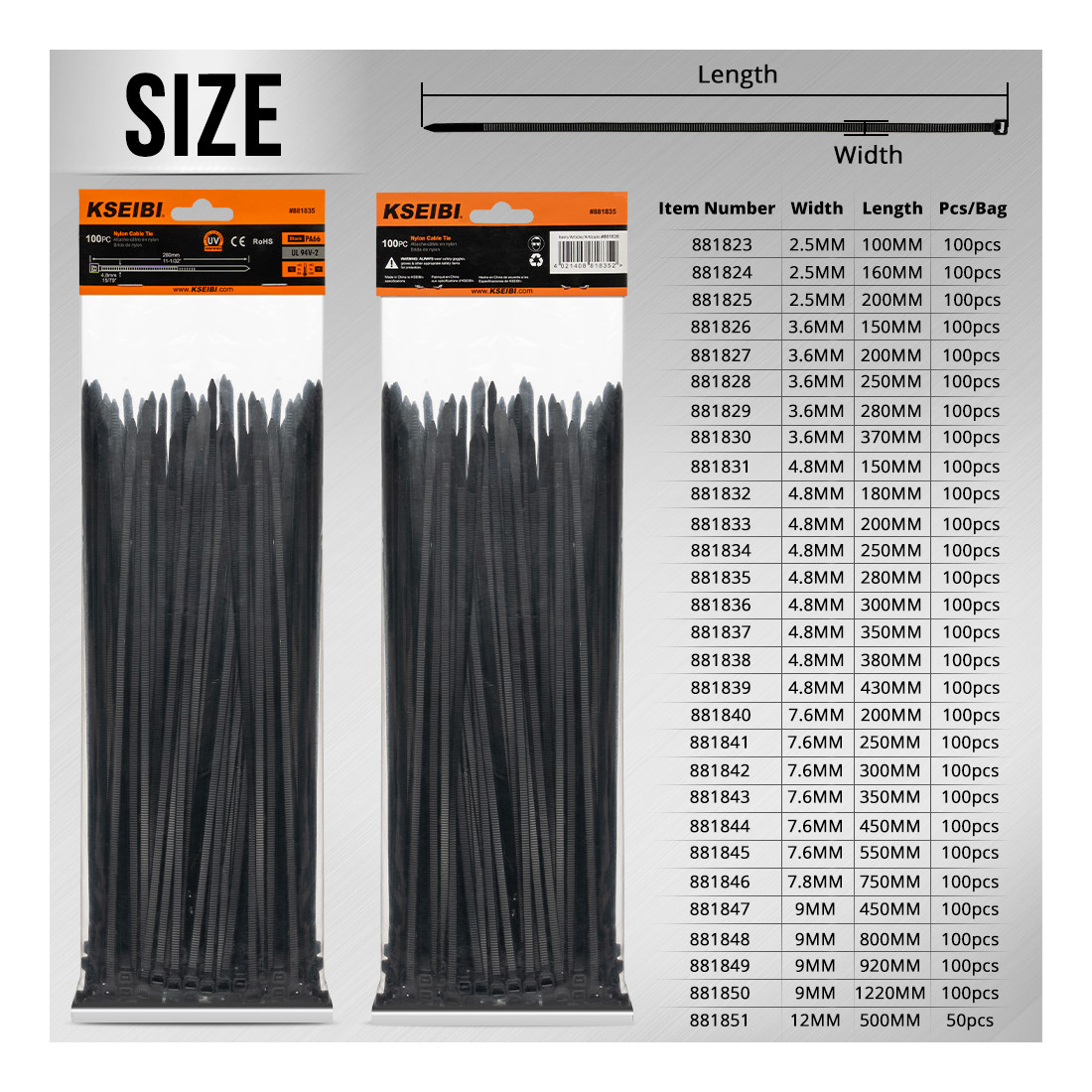 KSEIBI Tools Нейлоновые стяжки для кабеля, черные