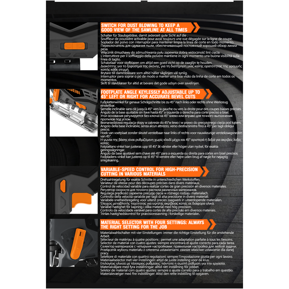 Quick and easy blade change with toolless system.