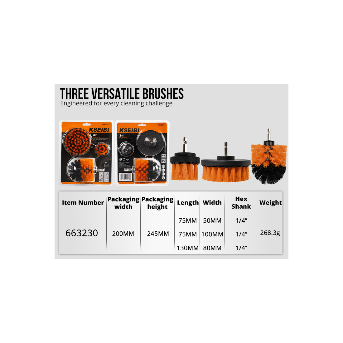 KSEIBI 1/4英寸六角柄电钻清洁刷套装(3支)为日常与重污清洁提供高效动力。三种刷头覆盖平面、边角与曲面:圆盘刷适合瓷砖地面与石材台面,圆弧刷进入盆槽、轮毂和转角,短毛硬刷用于缝隙与顽渍点位。接入任何标准1/4英寸六角夹头的有线或无线电钻即可使用,安装迅速,扭矩传递稳固。 刷毛采用耐磨尼龙,兼容多数中性或碱性清洁剂,既能强力去垢,又不易刮伤常见硬质表面;加厚基座与金属柄杆连接牢靠,耐用性符合KSEIBI对精度与可靠性的要求。 适用于物业保洁、维修保养、汽车美容、厨房与卫生间深度清洁等场景,显著缩短作业时间并提升一致性。对于需要在瓷砖缝、石材、金属件、玻璃纤维或涂层表面进行快速去污的专业团队和设施维护人员,这是一个实用而稳妥的选择。